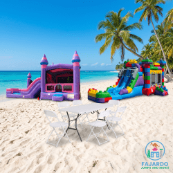 This package includes your choice of 1 Bounce & Slide Combo Unit wet, with (2) 6ft foldable tables, and 12 chairs!